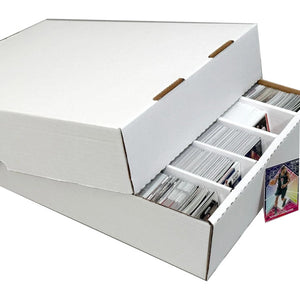 The BCW Storage Box is the highest quality, most competitively priced cardboard storage box on the market today. They are constructed of white corrugated paper and have a 200 lb. test strength. Use this box to store and protect collectible trading cards like: baseball cards, basketball cards, football cards, Magic The Gathering, Yu-Gi-Oh, Pokemon, and others.