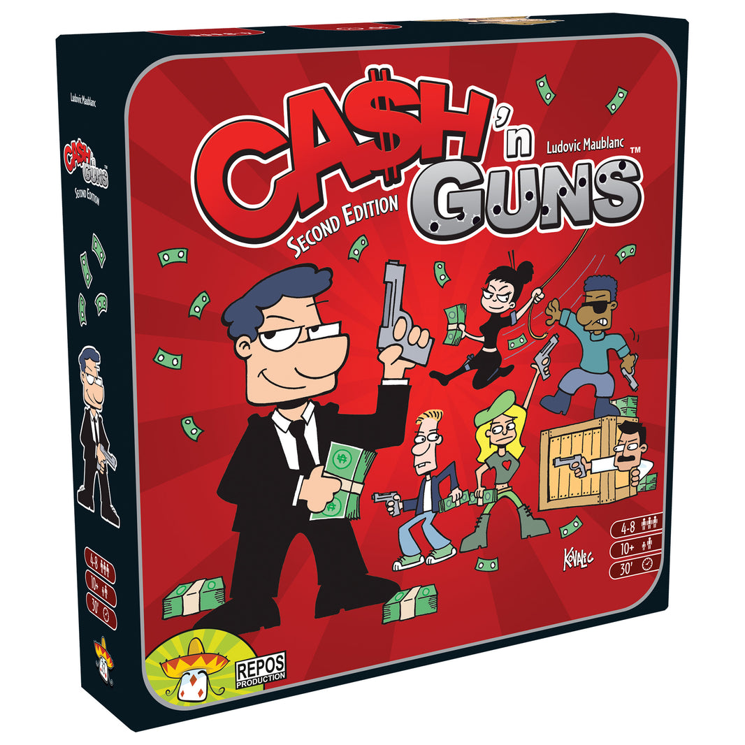 In Cash n Guns Second Edition, use foam pistols to bluff and intimidate your opponents to get the largest share. The bravest crooks enjoy the most money—but only if they live long enough to spend it!